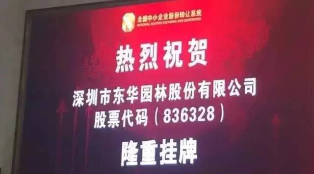 2016年4月19日下午,深圳市东华园林股份有限公司(证券代码:836328)新三板挂牌上市敲钟仪式,在北京金融大街全国中小企业股份转让系统隆重举行。东华园林董事长程华荣女士(威廉希尔williamhill2013级创业EMBA学员)及股东代表、券商代表等出席了仪式。