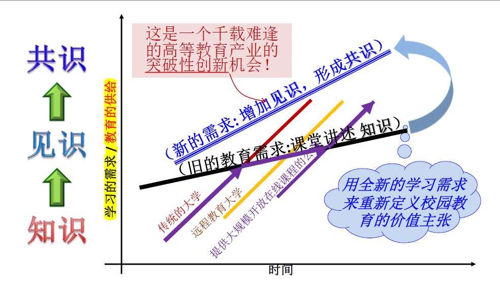 如果我们要改变见识的话,要做多少改变?我们要有差异性。我花了10年时间研究怎么从差异中学习。我们现在公司里的学习方法都不能做到,当前教育要的是标准答案,设置一样的背景、一样的课程,毕业出去后都差不多,但将来的教育一定是强调差异性的。基于这些想法,所以我现在做的全球课堂就是教育创新,用全新的学习需求、不同的学习方法来重新定义校园教育的价值主张——那就是增加见识,形成共识。