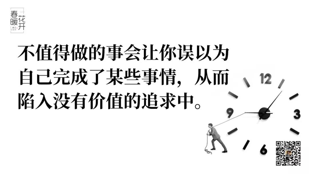 在很多时候我们是自己的奴隶,常常让自己陷入到事物中去,事实上并不是每一件事情都必须做,如果我们花时间去做不值得做的事情,就会浪费时间,有些人认为,不管怎样总算是做了一些事情,总比什么都没有做好。事实上,这样比什么都不做还要糟糕,因为不值得做的事会让你误以为自己完成了某些事情,从而更加陷入没有价值的追求中。