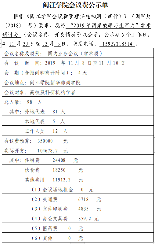 “2019年两岸效率与生产力”学术研讨会 开支情况