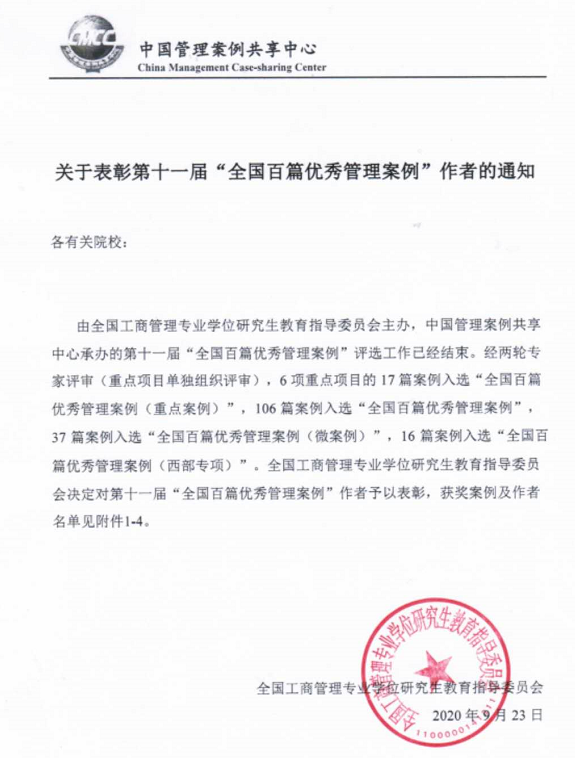 被誉为中国管理案例界奥斯卡的“百优案例”是全国工商管理案例领域的最高奖项。案例教学在工商管理教学中的地位和作用举足轻重,积极开发高水平的管理案例是我国MBA教育的重要基础性工程。“优秀管理案例”是国家一级学科评估指标中“工商管理”学科的唯一特色指标,先后被纳入教育部2012年第三轮学科评估指标体系(C5指标)和2016年工商管理硕士专业学位水平评估指标体系(C1指标)。