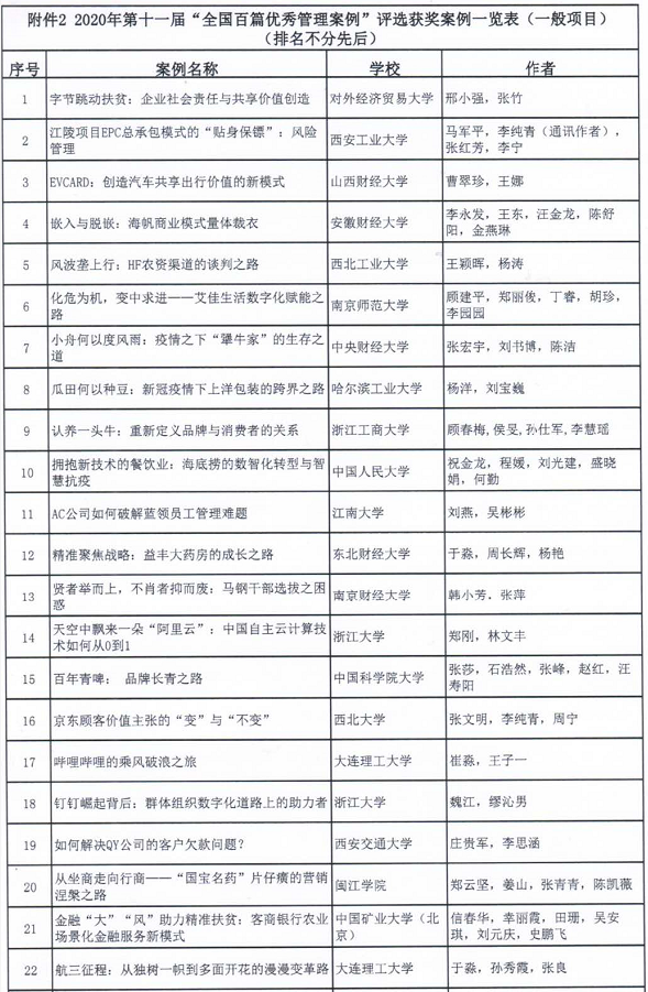 本届评选于2020年3月30日启动,共收到来自全国142所院校的1030项投稿,专家评审会依据案例撰写标准,严格把关,最终确定中国人民大学、上海财经大学等5所院校的6个立项17篇案例入选“全国百篇优秀管理案例(重点案例)”,中国人民大学、复旦大学、威廉希尔williamhill等58所院校的106篇案例入选“全国百篇优秀管理案例”,入选案例约占投稿数的12%左右。