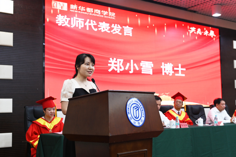 教师代表郑小雪博士在浓浓的不舍之中,为毕业生们送上了祝福。作为师长,最关心的是员工在未来的生活能够快乐并且有成。快乐是保持初心、与人为善的愉悦、振奋和满足;有成则需要一心一用的投入与坚持,预祝各位同学在全新的人生篇章书写出属于自己的纯粹和精彩。