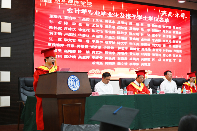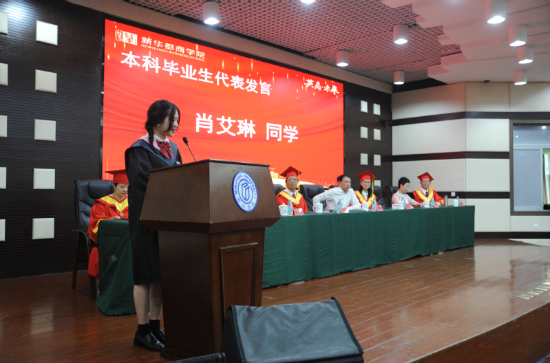 2021届本科生毕业生代表肖艾琳回顾了四年的商院生活、成长与收获,感恩陈发树先生的慈善精神,感念母校应用型卓越商科人才培养体系的兼容并包,并代表毕业生们发出声音——每位商院人,都应以满腔热情投身社会建设,以理想信念锤炼青年担当,不煞锐气、不失勇气!