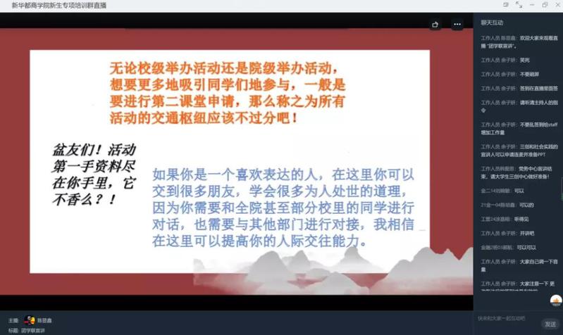 宣讲开始之前,主持人陈显鑫组织同学们观看了由商院全媒体中心制作的暖场视频,调动了线上宣讲会的气氛。随后,宣讲正式开始,主持人陈显鑫对学弟学妹的到来表示热烈的欢迎,同时简单介绍了院团学联的组织架构。本次院团学联线上纳新宣讲会分为上下两场。各部门宣讲人轮番登场,从工作性质、工作内容及部门特色等方面依次为新生展开讲解。一张张精心准备的PPT,一帧帧多彩绚丽的照片,一段段独具匠心的视频,在新生们心中勾勒出了一张团学联员工工作的蓝图。