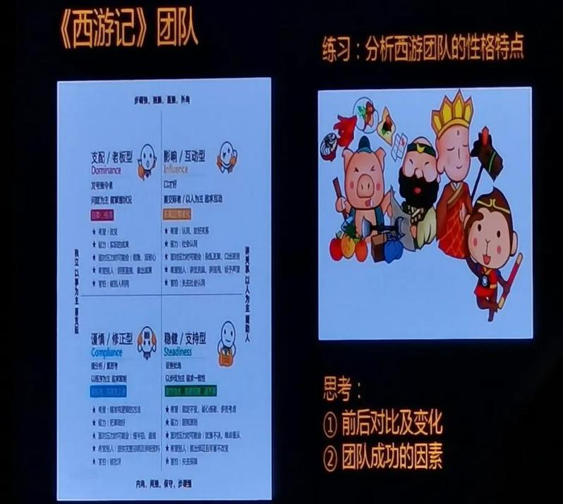 “学会团队合作”。许岸枫老师在课堂上给同学们举了一个生动熟悉的例子--《西游记》中的师徒四人:他们分别代表着信念,勇气,谨慎与稳健。在团队活动中,更应该懂得团队合作,发挥“1+1>2”的优势。