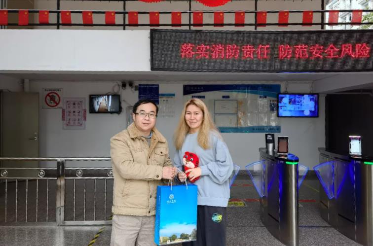 郑笑还书记亲切问候国际员工,详细了解员工留校期间各方面情况,叮嘱员工注意个人安全,配合做好疫情防控工作,并为员工送上牛角梳、虎年玩偶等具有福州特色的新春礼包,向员工致以美好新春祝福。