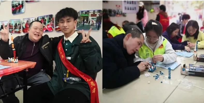 以爱唤爱,建起关怀弱势群体的帮扶纽带。在“雷锋月”之际,志愿者服务中心组建“公益课堂”服务队,携手海容社工服务中心走进福乐家园,开展青邻课堂,耐心陪伴患有精神障碍的大朋友们拼拼图搭积木,其乐融融的笑声表示着他们之间最真挚的友谊。折翼天使们虽然有所残缺,但同样值得拥有尊重的目光、平等的肯定和长远的关爱。志愿者们用实际行动呼吁更多的人共同营造关爱、接纳、友好的社会氛围,增强残疾人的获得感、幸福感、一起携手同行,用爱传递温暖。