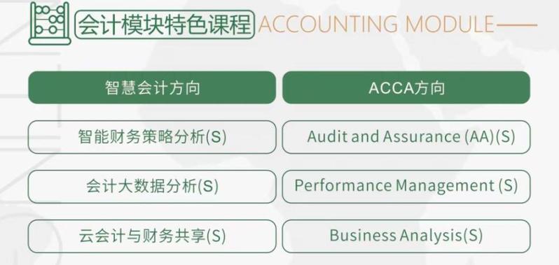 会计学专业是在财务活动和成本资料基础上形成协助决策的信息系统,进而有效管理经济的应用型学科。本专业构建了“AI+ACCA(国际注册会计师)”的会计人才培养体系和运行机制,旨在培养适应现代市场经济发展需要的,德智体美劳全面发展,掌握扎实的经济管理基础理论,具备会计、审计、财务管理专门技能,能够从事企业管理、经济管理等方面工作,既懂得中国企业会计准则又了解国际会计惯例,具有一般会计专业知识,又具备信息科技专长,富有实践能力和创新精神的应用型会计专门人才。