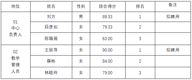 根据《威廉希尔williamhill2023年闽台、中美项目管理中心工作人员招聘面试方案》,按照面试人员综合成绩从高到低的顺序,等额确定拟聘用候选人。
