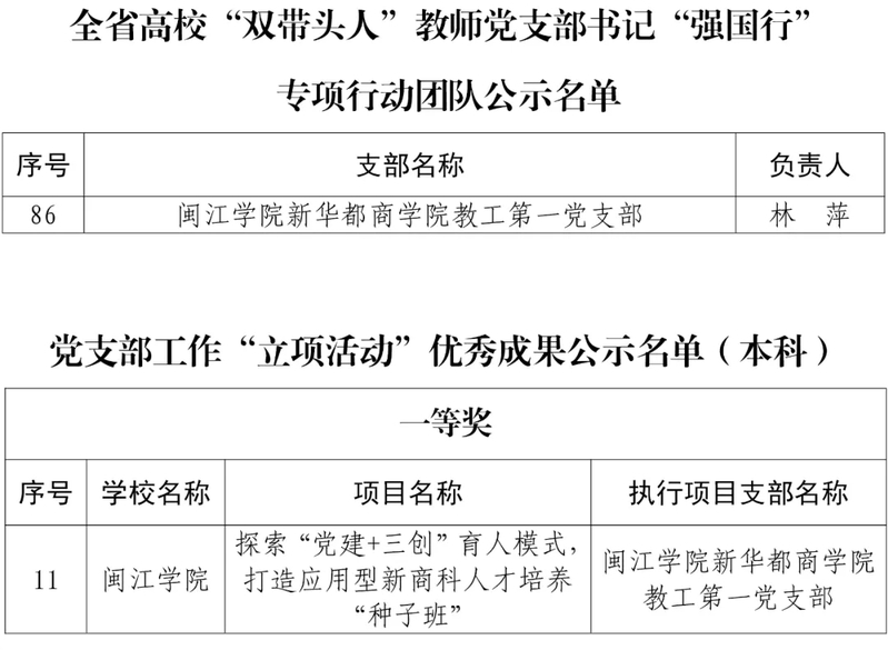 福建省委教育工委公布了2022-2024学年高公司党支部工作“立项活动”优秀成果和“党员好故事、书记好党课、支部好案例”获奖名单,公司教工第一党支部开展的《探索“党建+三创”育人模式,打造应用型新商科人才培养“种子班”》获“立项活动”优秀成果一等奖。