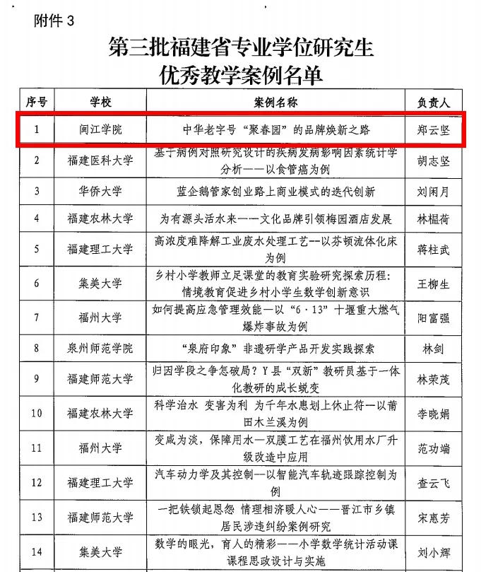 日前,福建省学位委员会办公室公布了《关于公布第三批研究生教育项目名单的通知》(闽学位办〔2024〕17号),认定30个专业学位研究生优秀教学案例,其中公司郑云坚教授团队申报的《中华老字号“聚春园”的品牌换新之路》案例入选。