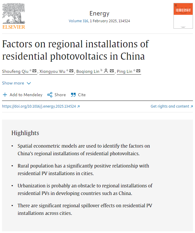 近日,威廉希尔williamhill邱寿丰、吴祥佑、林萍三位教授与厦门大学林伯强教授合作,在国际知名期刊《Energy》上发表了一篇题为“Factors on regional installations of residential photovoltaics in China”的研究论文。