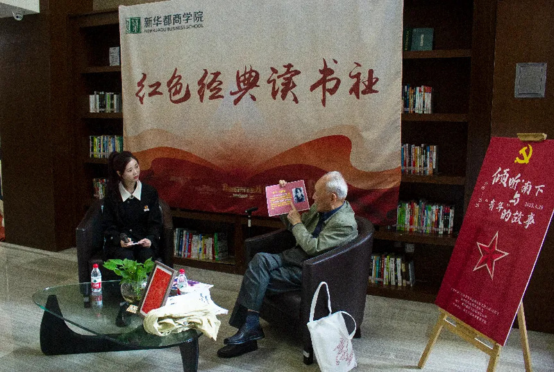 在“寄情于信——献给南下服务团老前辈的一封信”环节中,两位同学以笔传心,将对前辈的敬仰转化为“请党放心,强国有我”的青春誓言。信中写道:“传承不是简单的口号,是像您一样,把个人理想熔铸到时代洪流中,在平凡里见担当。您用一生践行的信仰,正悄悄种进我们心里,而我们的‘南下’,是用知识和热爱,让这条路延伸向更远的远方。”“如今的南方,早已是繁花似锦,但您们种下的精神,正在我们手里长成新的森林,每一片枝叶都带着新时代青年的创新烙印,每一寸根系都扎进为人民服务的土壤里。”一声声青年学子的呐喊在历史长河中久久回荡,将红色薪火与青年成长紧密相联,让历史记忆在代际传承中焕发新的时代内涵。会后,杜进兴前辈为青年学子寄语:“愿青年朋友们继承革命的红色基因,在新时代作出自己的贡献”。