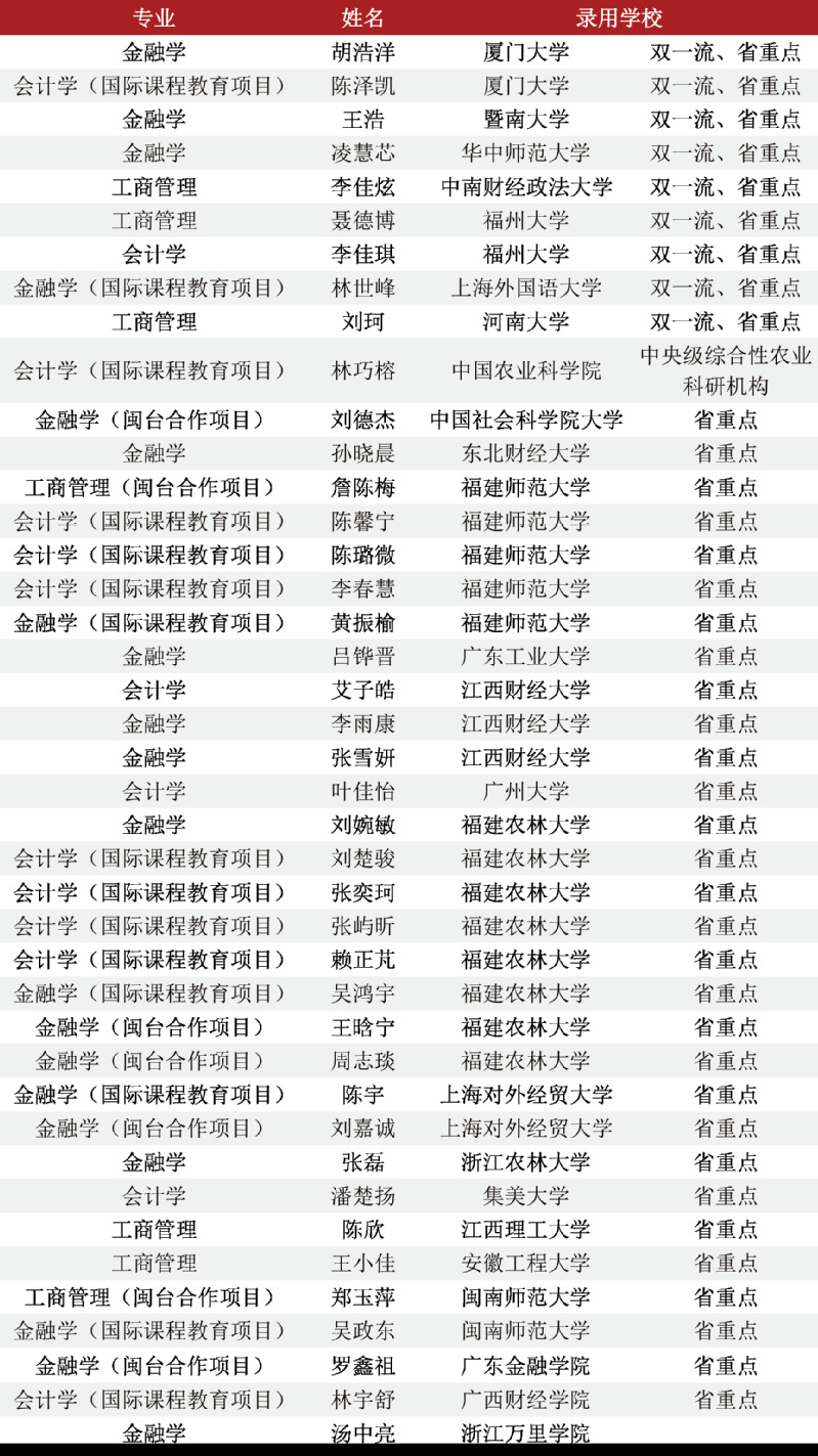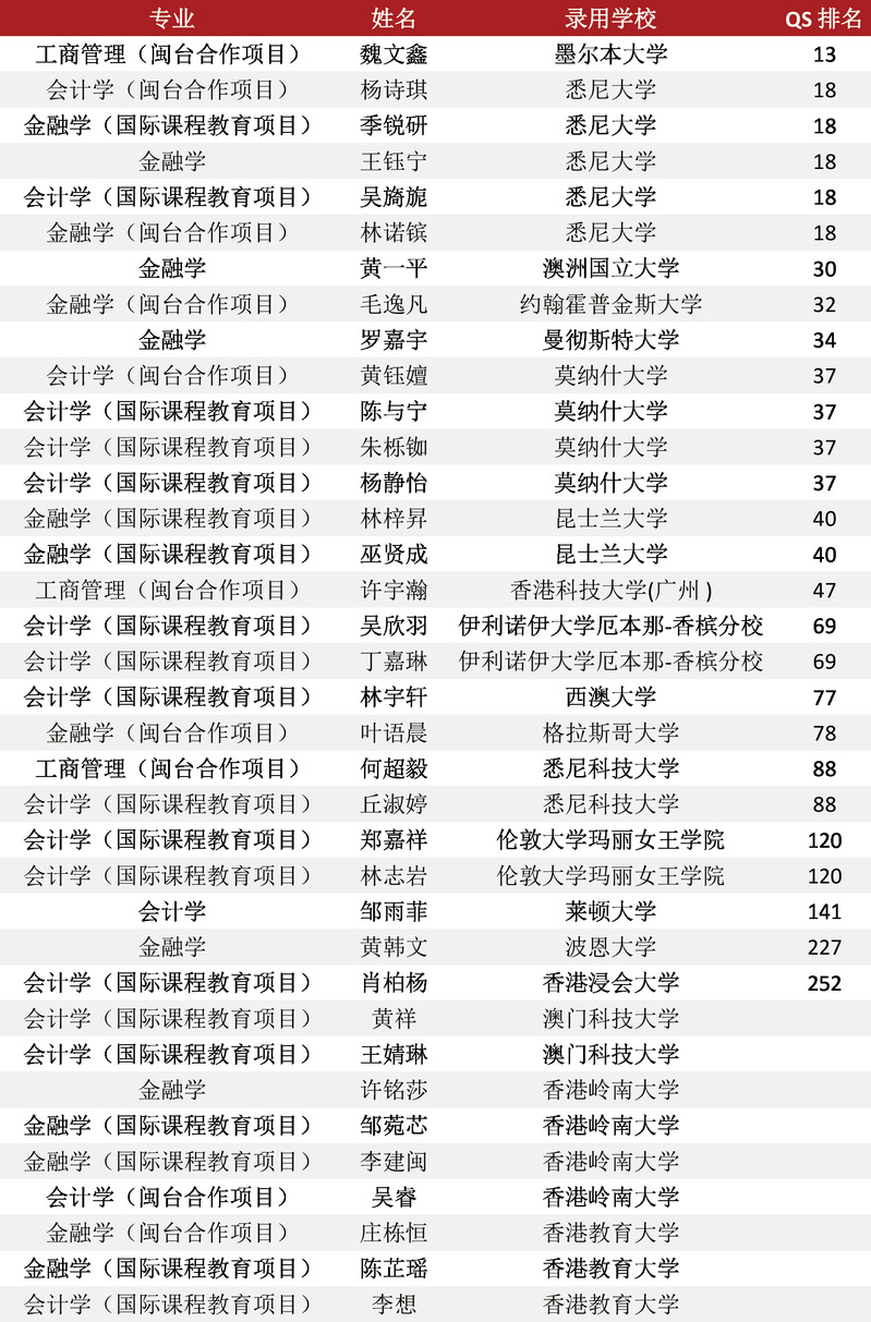 商海扬帆终破浪,研途砺剑展锋芒。威廉希尔williamhill2025届毕业生升学深造率再创新高!截至目前,1名硕士研究生录取博士研究生,实现硕士升学新突破。77名本科毕业生录取硕士研究生,本科生升学率14.2%,其中境内升学41人,境外升学36人。境内升学中,21.95%员工考取厦门大学等双一流院校,省重点建设高校占97.56%,境外升学中,61.11%员工进入墨尔本大学、悉尼大学、香港科技大学等QS排名前100名的知名院校。他们以扎实的专业素养、创新的商业思维和坚韧的拼搏精神,在激烈的竞争中脱颖而出,成功叩响国内外知名高校深造之门。