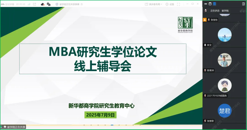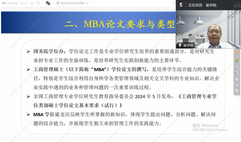 崔学刚经理以5篇优秀工商管理(MBA)研究生学位论文为例,从选题质量、研究设计、论证逻辑、写作规范与评审要求等方面逐一解析,讲解了一篇合格的工商管理(MBA)研究生学位论文应符合的要求,并现场对2篇待送审论文进行指导,就论文结构、研究方法、逻辑梳理等问题提出修改意见,帮助研究生掌握高质量论文的写作要点,规避论文写作中容易犯的错误。
