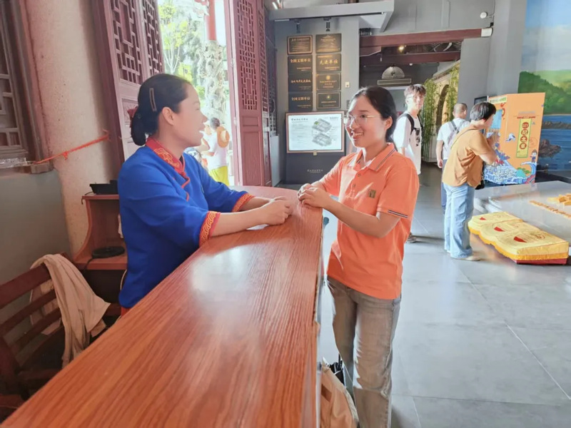 实践队走进湄洲妈祖祖庙了解妈祖生平与庙宇承载的信俗文化;走进古厝建筑理解妈祖文化的历史脉络与文化意义;在海鲜干货特产摊位,观察妈祖文化对当地产业的浸润——带有妈祖元素的包装、商户传承的诚信经营理念,都是文化融入生活的体现。
