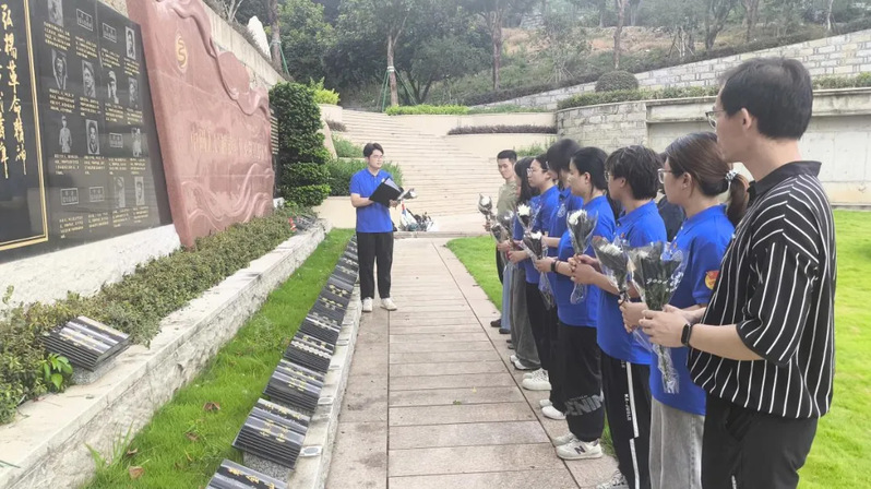 在静谧肃穆的氛围中,实践队员手捧洁白的菊花,神情庄重,列队肃立于巍峨的纪念碑群前,深深鞠躬,敬献鲜花。