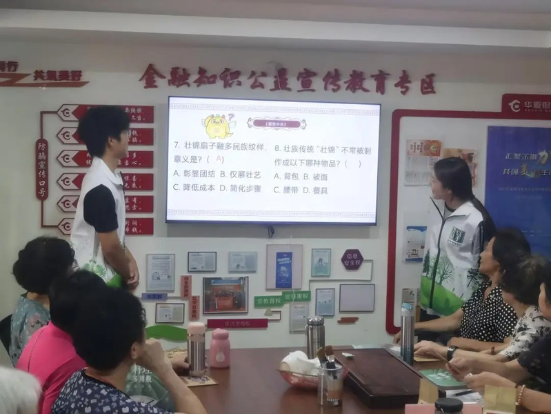 志愿者通过多媒体对壮族人口分布、三月三歌圩节的对歌狂欢、五色糯米饭的制作寓意以及抛绣球等传统游戏进行讲解,让参与者了解壮族文化,初步建立参与者与壮族文化的纽带。金融防诈专项宣讲环节,志愿者结合老年群体常见的诈骗场景开展针对性科普,通过案例讲解+误区提醒+实操指导形式,重点拆解民族资产解冻”“虚假民族文化投资”“养老理财诈骗三类高频骗局。