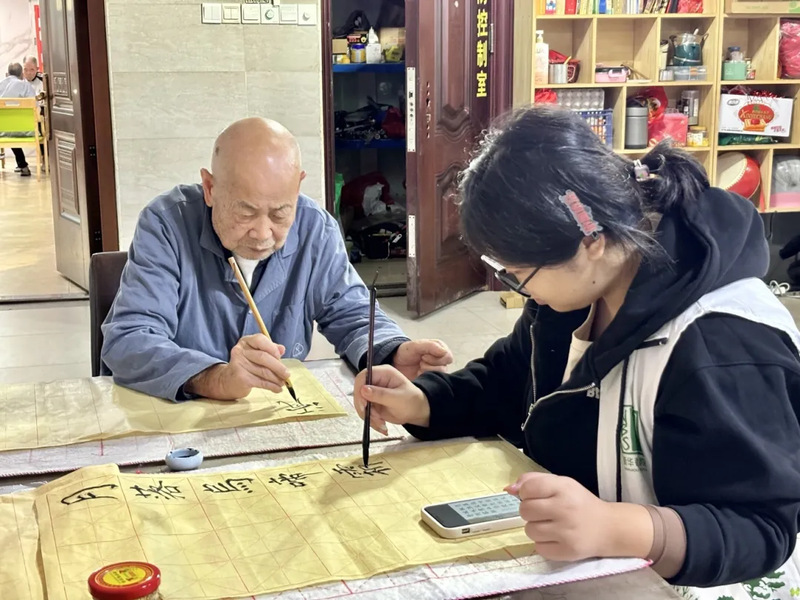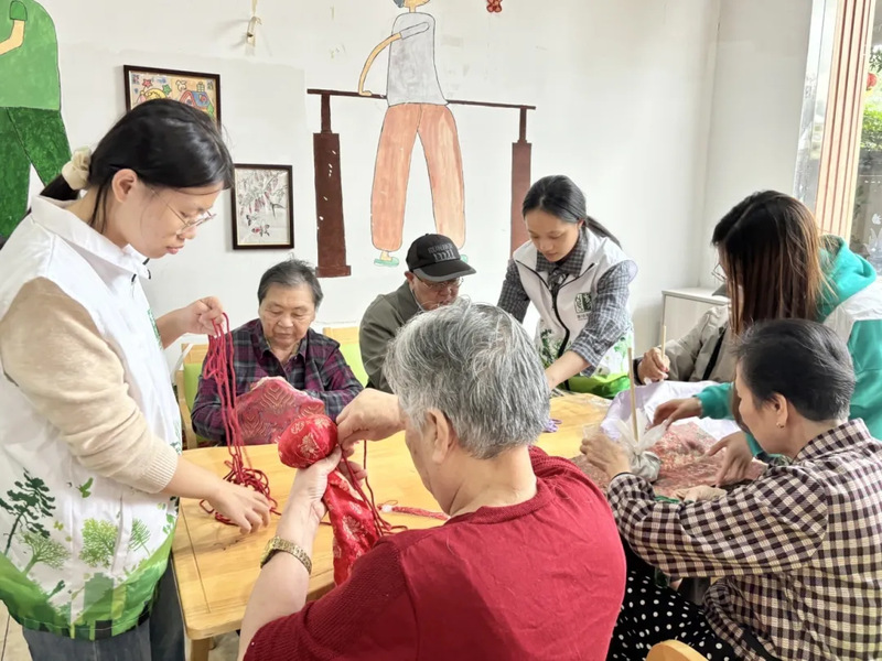 活动以重阳节文化为核心,结合传统艾草手工艺,将“养生敬老”理念融入志愿服务。活动现场,员工讲解重阳节的习俗渊源与艾草的驱寒养生功效,手把手指导老人们制作艾草锤,帮助他们完成专属的“重阳伴手礼”;组织书法互动与歌曲传唱环节,与爱好书法的老人共挥毫墨,共唱《茉莉花》《歌唱祖国》等经典歌曲,歌声与笑声交织,现场暖意融融。